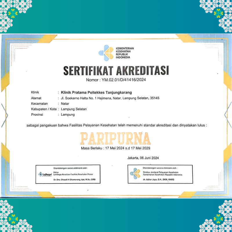 Pencapaian ini menunjukkan bahwa Klinik Pratama Poltekkes Tanjungkarang yang berlokasi di Jl. Soekarno Hatta No. 1 Hajimena, Natar, Lampung Selatan telah memenuhi seluruh standar pelayanan kesehatan yang ditetapkan, baik dari sisi manajemen, mutu pelayanan, hingga keselamatan pasien.
